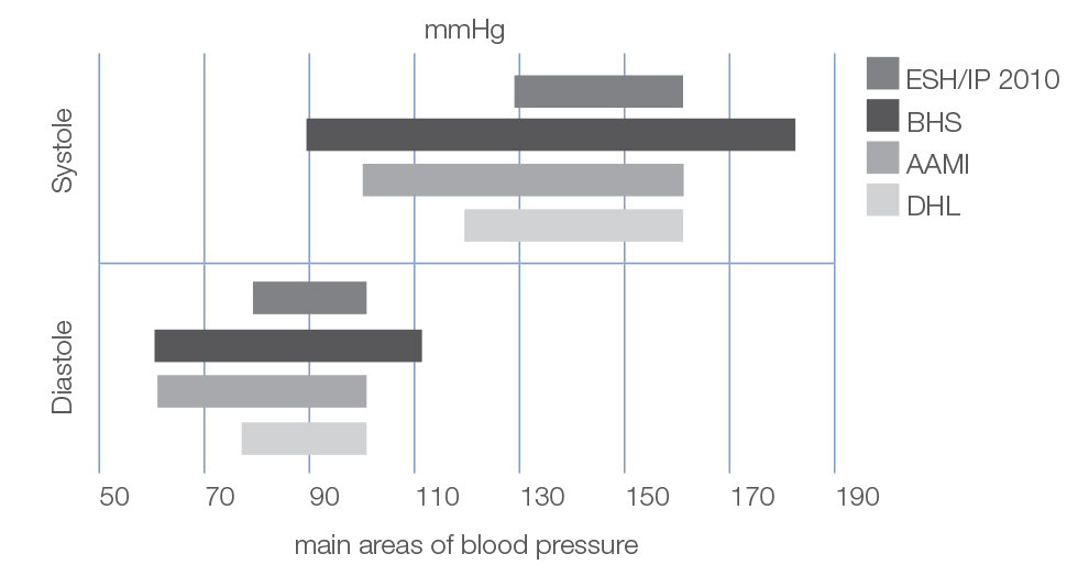 Toinen ero on tutkituissa verenpainealueissa: Verenpainealueet, joissa verenpainemittareita tarkistetaan mittaustarkkuuden suhteen, eroavat protokollasta riippuen (katso kuvaaja). Mitä laajempi valikoima on, sitä paremmin laitteet tarkistetaan luotettaviksi erittäin matalalla tai erittäin korkealla verenpaineella.